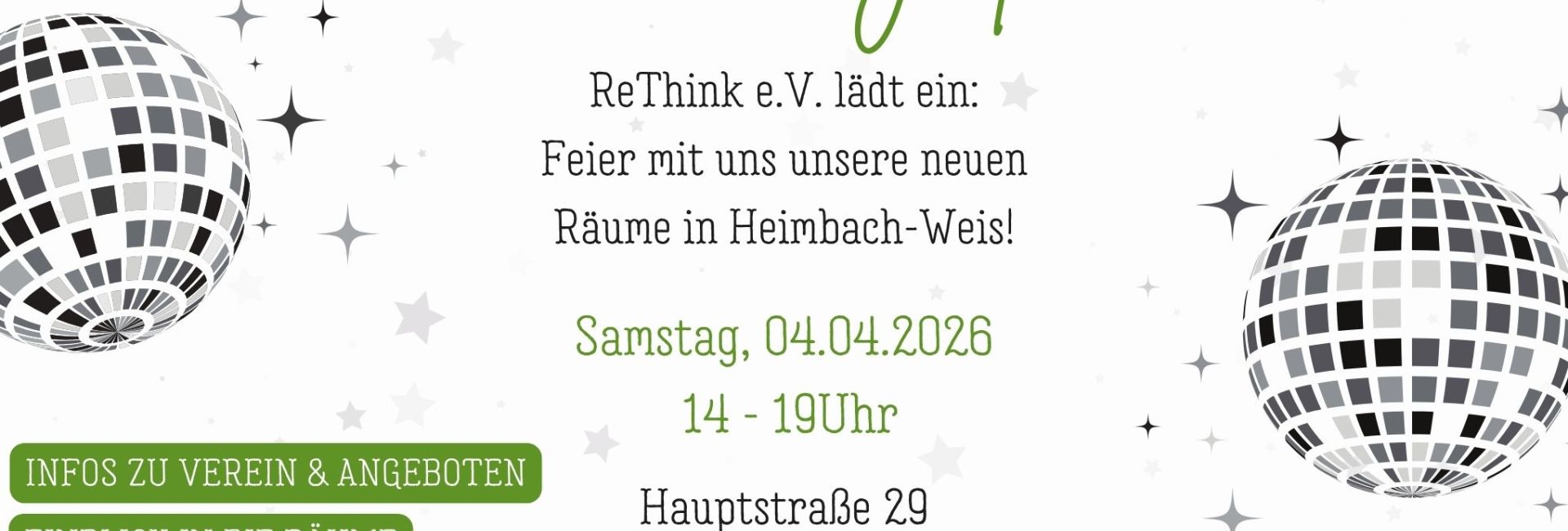 Feiert mit uns am Samstag, 04.04.2026 ab 14Uhr die neuen Räume von ReThink e.V. in Heimbach-Weis. Neben regelmäßigen Workshops bieten wir hier einen Stricktreff, einen monatlichen Hacker- & Makerspace, außerdem für Mitglieder ein umfangreiches Leihangebot von Buch über Brettspiel bis hin zur Bohrmaschine.